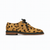 Hair on cowhide. Printed black pattern. Wood sole stacked with hand nailed leather heel. Calfskin lined.